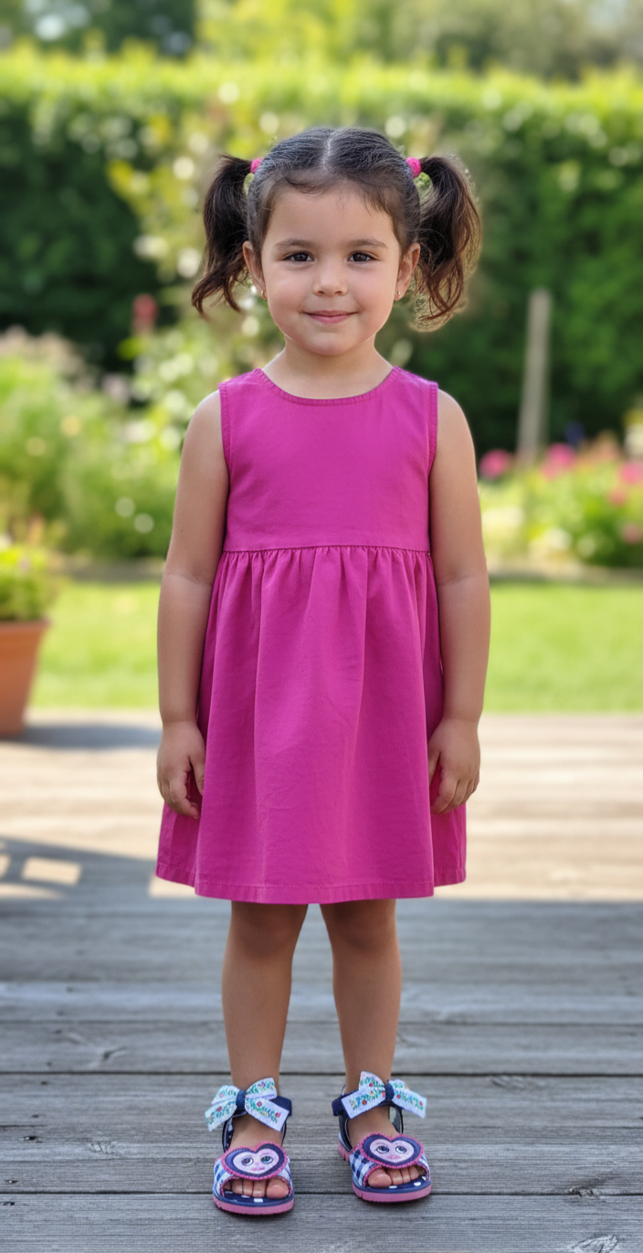 Sandalía combinada en piel azul y entelado de cuadros de vichy. Ajuste con velcro en tira delantera y en pulsera. Aplicación de corazón en piel con cara bordada. Corazón rosa en piel y lazo decorativo en pulsera.