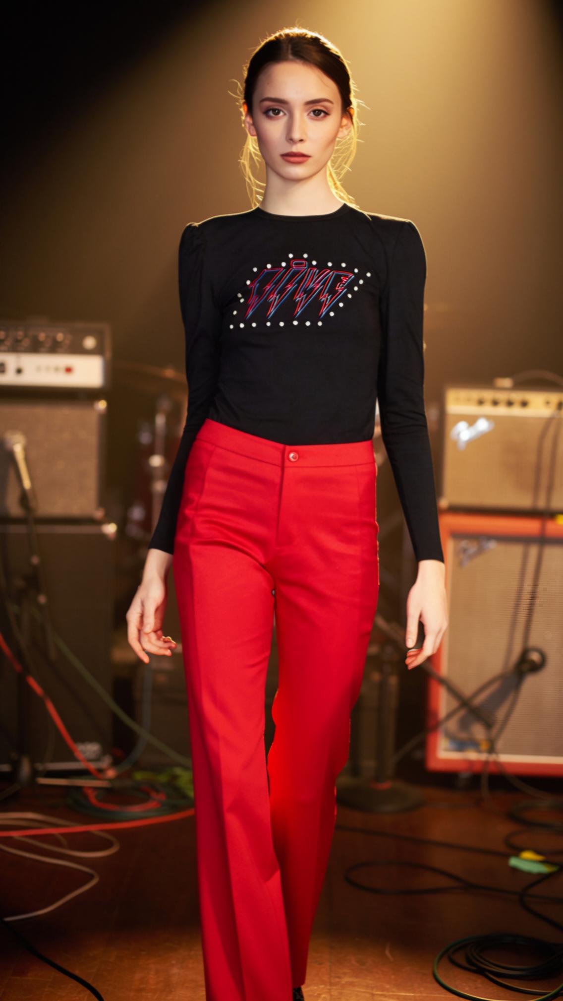 Camiseta de algodón, cuello redondo y manga larga con rizo en hombro. Delantera con bordado "VIVE" y perdreria.