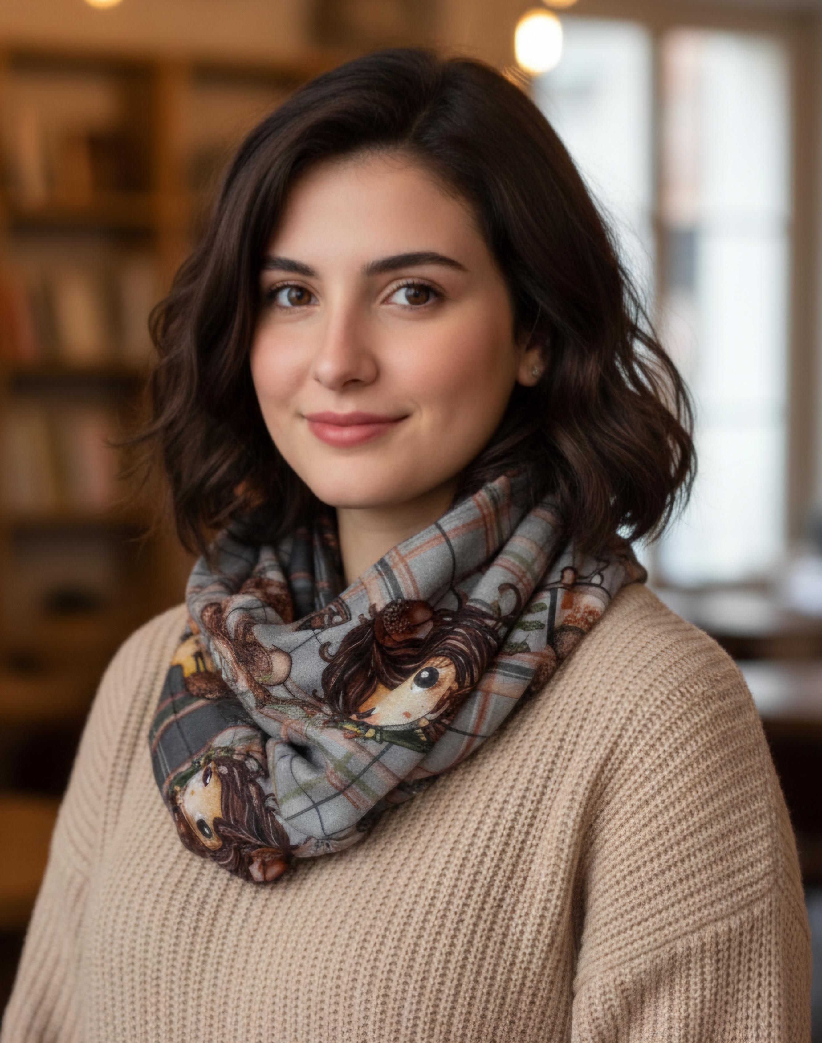 Cuello tipo braga en punto lana. Estampación a cuadro con muñequita Mary.