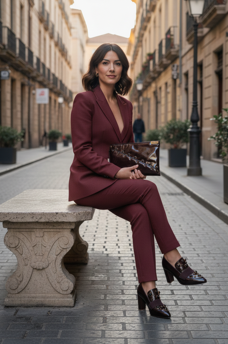 Zapato Salón alto de empeine. Tacón alto grueso. Piel con brillo y tachas decorativas. Disponible en negro y en Burdeos. Bolso de mano a juego.