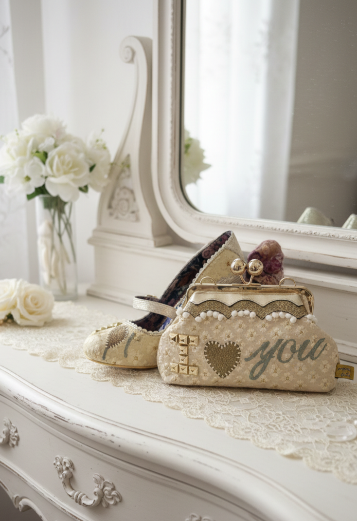 Bolso tipo monedero, beige y dorado con bordados y aplicaciones. Frase bordada delantera I Love You, Cinta para colgar de bandolera. A juego con zapatos novios.